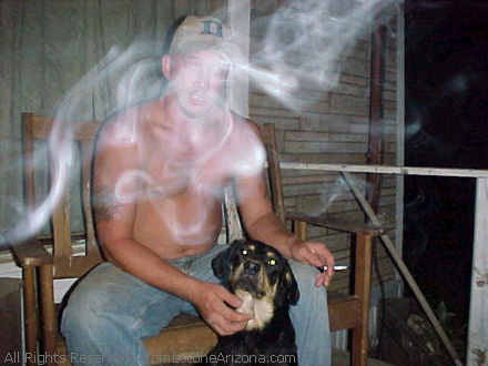 This photo is of my husband at our house. It was taken 3 days before the house burned to the ground. The fire started in our bedroom behind my husbands head, he managed to get out safely. We believe it was a warning from his grandmother. Photo taken a with Mavica digital camera August 2002.